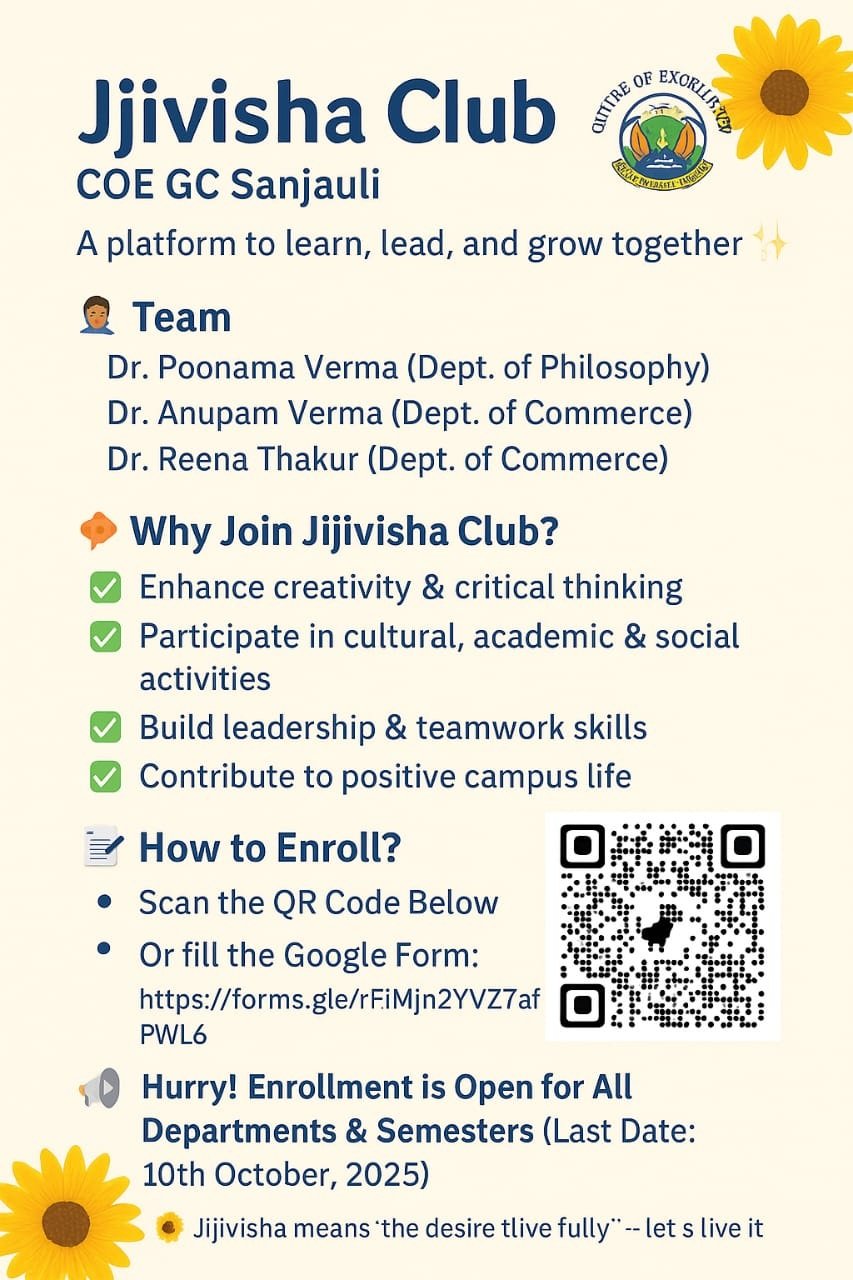 Jijivisha is a social outreach cell that was set up in the college to inculcate in the students, the value of social responsibility and concern for the lesser privileged. The principal, Dr J S Negi authorized its formation in the month of July, 2015.