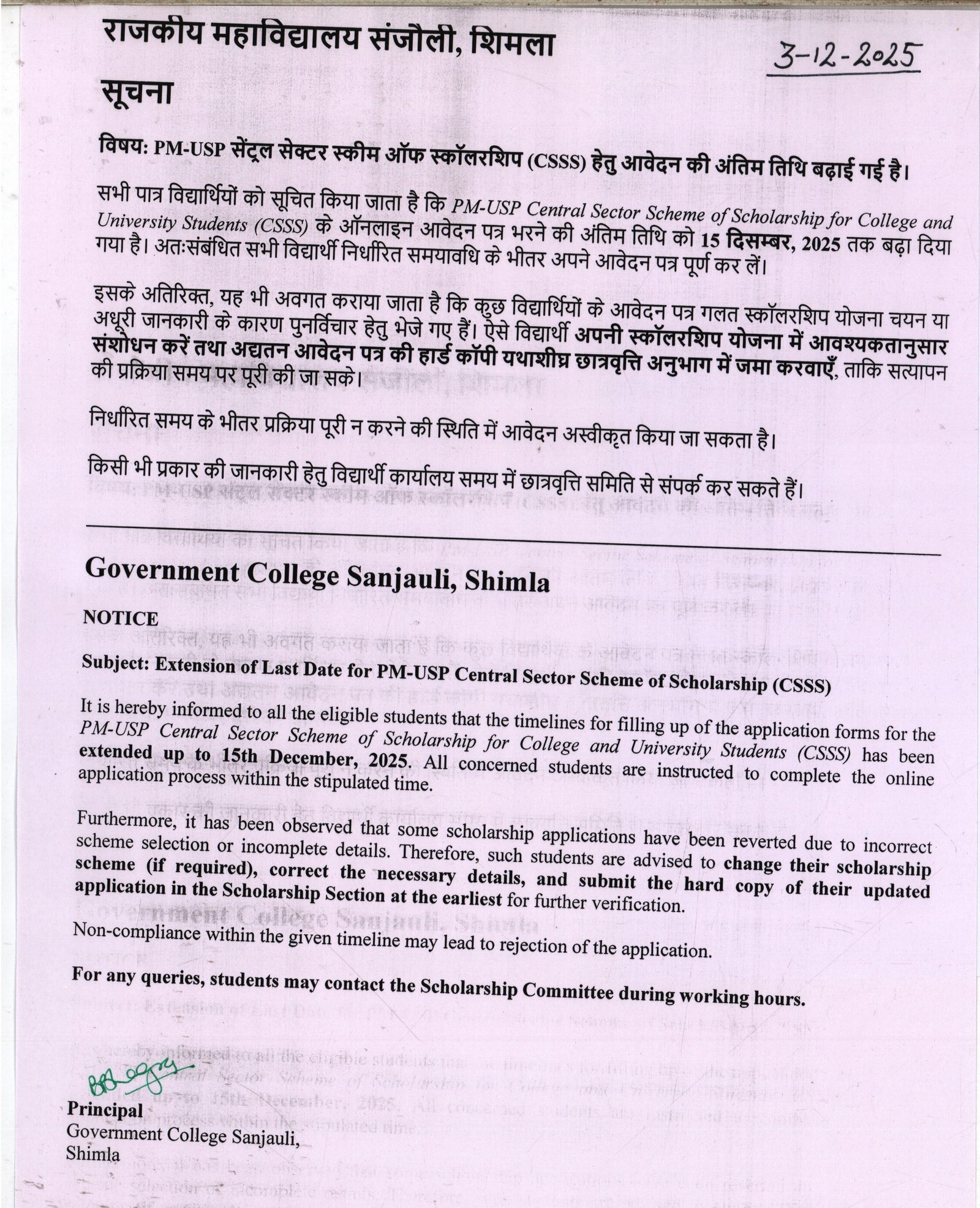 A number of scholarships are available for eligible and deserving students. Information regarding dates, eligibility conditions and procedure for these scholarships are notified by the college authorities from time to time.Centre of Excellence, Government College Sanjauli, Shimla-6 is committed to the goals of attracting and supporting best calibre students across the state. In order to encourage deserving students to pursue their higher education, this college provide scholarship to meritorious students as per the policy of the state and centre government’s scholarship schemes. All the centre and state sponsored schemes are given as per the instructions of the government.