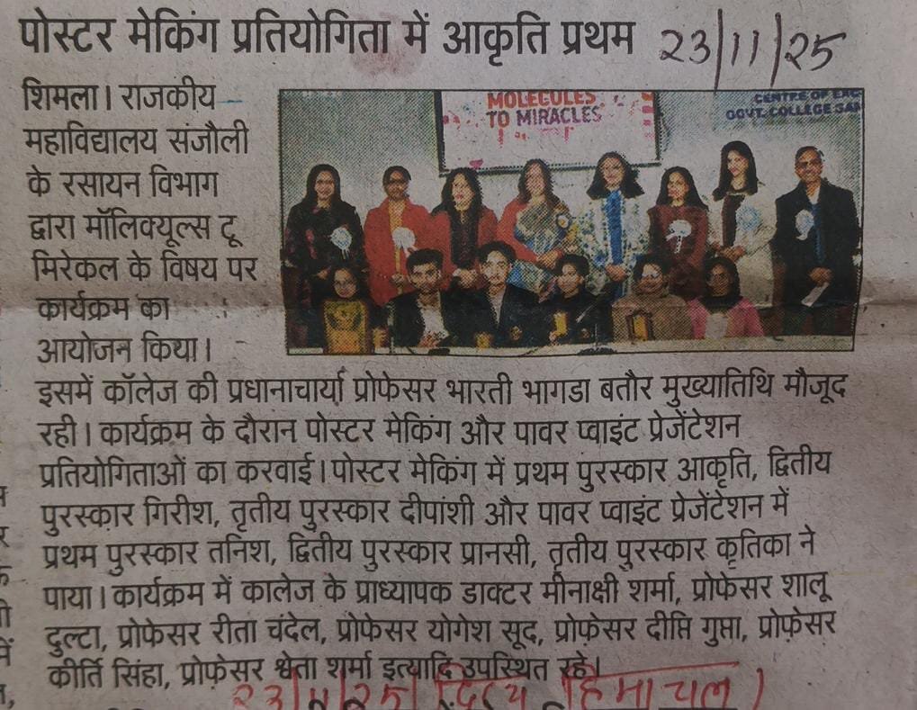 The Department has undergraduate programme in Chemistry with the enrolment of about 480 students. It is a dynamic growing department with faculty dedicated to providing quality education through innovative programmes through STAR college scheme.