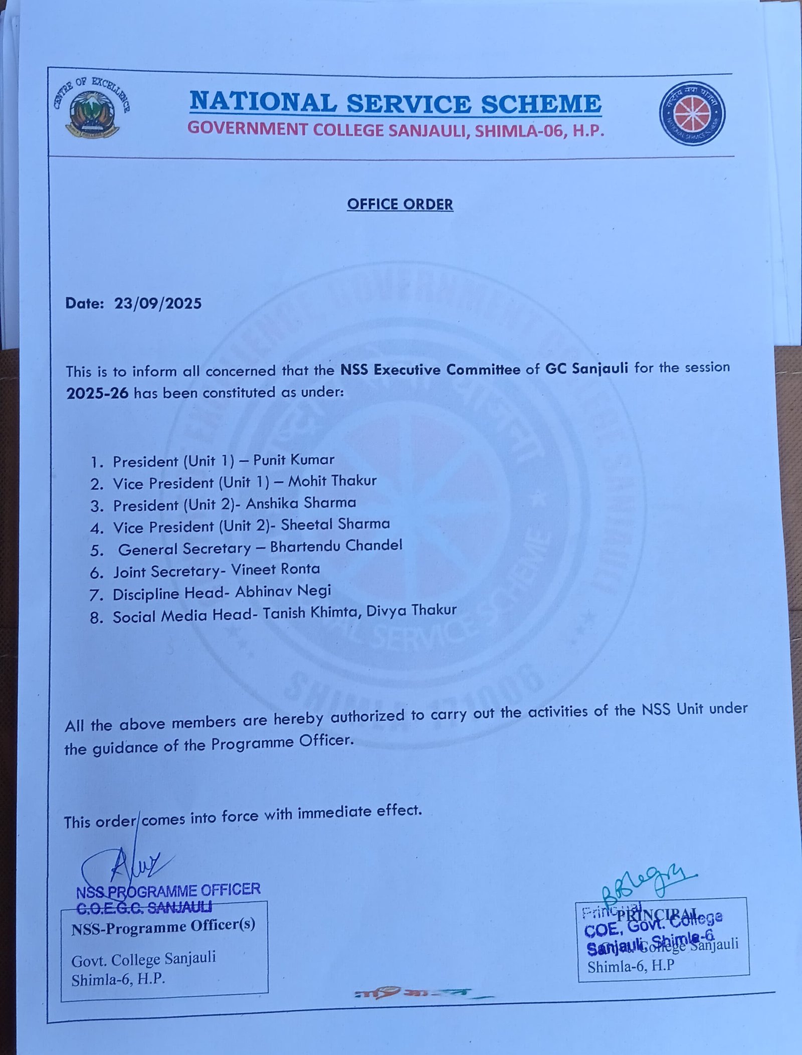 By and large he/she (P.O.) plays the role of an organizer, an educator, a coordinator, a supervisor, an administrator and a public relations person to improve the quality and magnitude of the NSS programme in the college/institution.