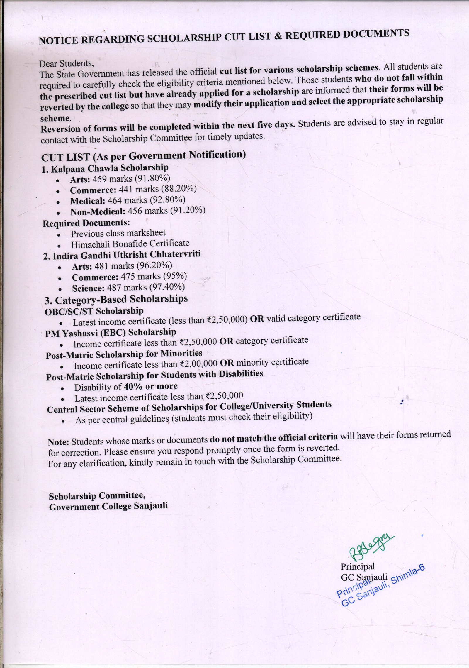 A number of scholarships are available for eligible and deserving students. Information regarding dates, eligibility conditions and procedure for these scholarships are notified by the college authorities from time to time.Centre of Excellence, Government College Sanjauli, Shimla-6 is committed to the goals of attracting and supporting best calibre students across the state. In order to encourage deserving students to pursue their higher education, this college provide scholarship to meritorious students as per the policy of the state and centre government’s scholarship schemes. All the centre and state sponsored schemes are given as per the instructions of the government.