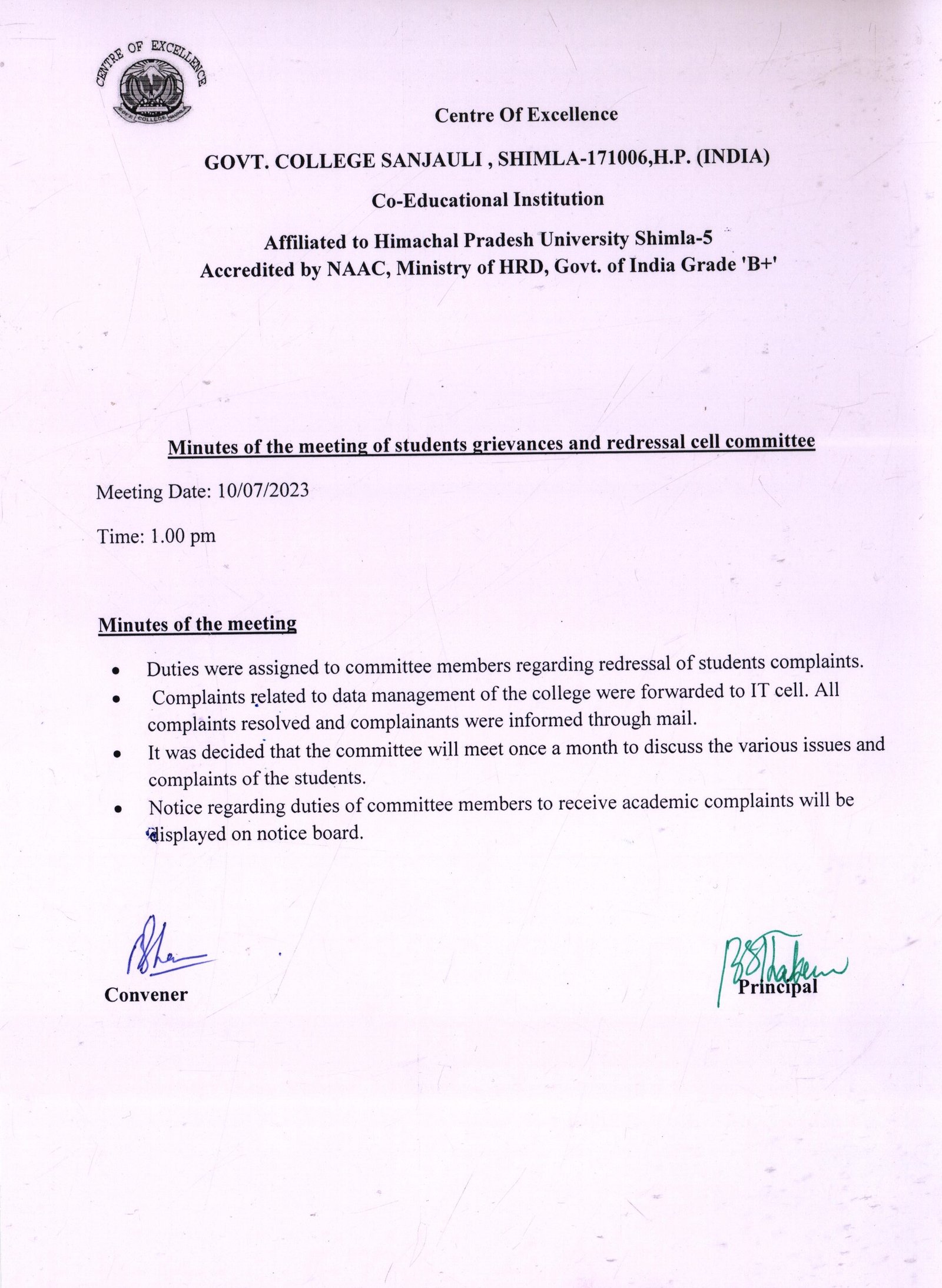 Centre of Excellence, Govt. College Sanjauli, Shimla-171006, H.P.